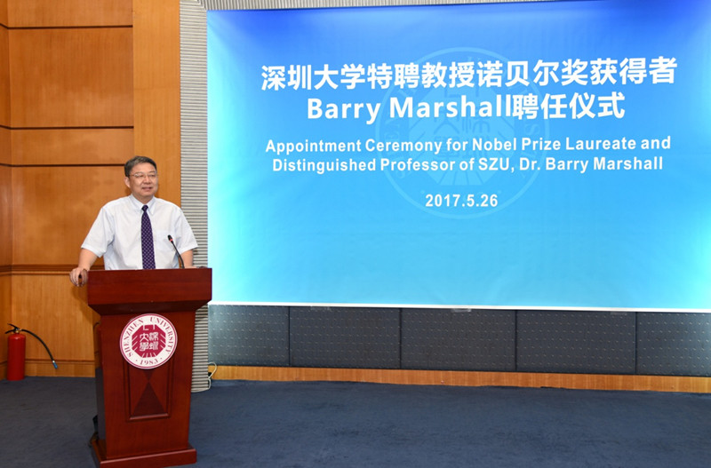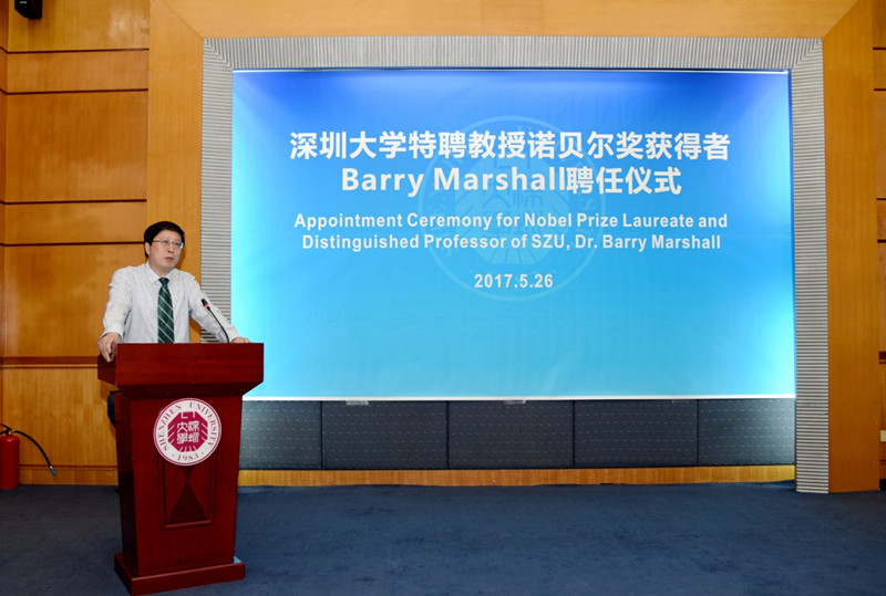 On the afternoon of May 26th, Appointment Ceremony for Nobel PrizeLaureate and Distinguished Professor of SZU, Dr. Barry Marshall has been held in SZU. Nobel PrizeLaureate Dr. Barry Marshall, President of SZU Qingquan Li, Vice President of SZU Wang Hui, Counselor of Guangdong Provincial People's GovernmentProf. Siping Chen, and the other related people from the office of Party & Government in SZU, Department of human resources, SZUHSC, Department of international exchange and cooperationand Office of discipline construction & development attended the ceremony. The ceremony was presided over by Vice President Wang Hui.