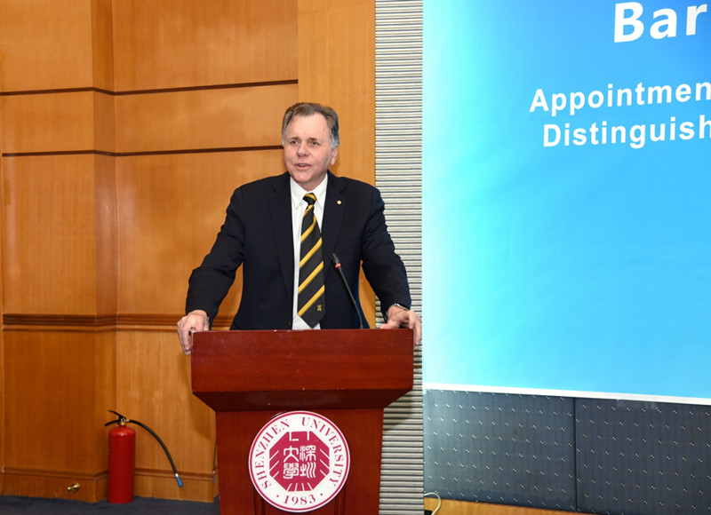 After that, President Qingquan Li made a speech;he first expressed his grateful thanks and warm welcome to Professor Barry Marshall who acceptedto be appointed as adistinguishedprofessor of Shenzhen University. He pointed out that the school of medicine is the fastest growing school although it is the youngest one in SZU. Only 8 years since its establishment, it has achieved gooddevelopment achievements.Especially in this year, the school of medicine moved to Xili Campus that opened a new chapter in the development of HSC. At the same time, Shenzhen University General Hospital will be opened by the end of this year, leading to further enhance the teaching level of the school. This time, Dr. Barry professorwas invited to join the school of medicine, which will bring great improvement of personnel training and scientific research strength of deep medicine, accelerating the transformation of world class scientific research achievements in Shenzhento benefit more people in Shenzhen.
