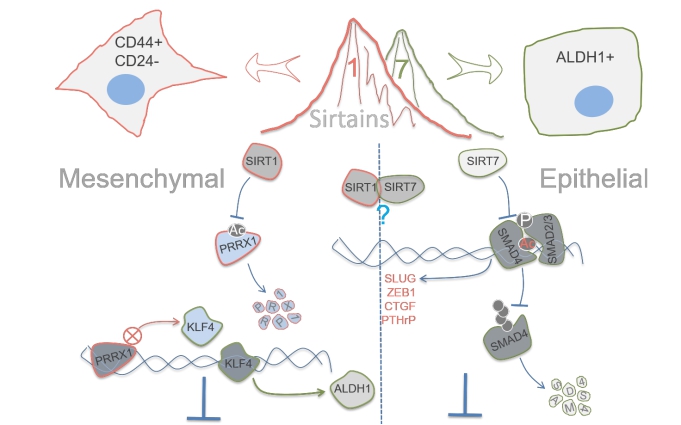 Aging is the biggest risk factor of age-related diseases like cancer. Epidemiologic studies have revealed that the incidence of breast cancer dramatically increases with ageing. We used the GenAge Human Genes list (detailing the reported genes associated with aging/longevity) to screen for genes that correlate with breast cancer stemness. We identified pro-longevity SIRT1, which is centered in a KLF4-ALDH1A1-ALDH1A3 triangle of a functionally interacting network and is associated with epithelial-like breast cancer stem cells (CSCs) (ALDH1+) (Oncogene, under revision*). By contrast, another sirtuin member SIRT7 is associated with mesenchymal-like CSCs (CD44+). Indeed, SIRT7 serves as modulator of TGF-β signaling and suppressor of breast cancer metastasis (Nat Comms 2017*).