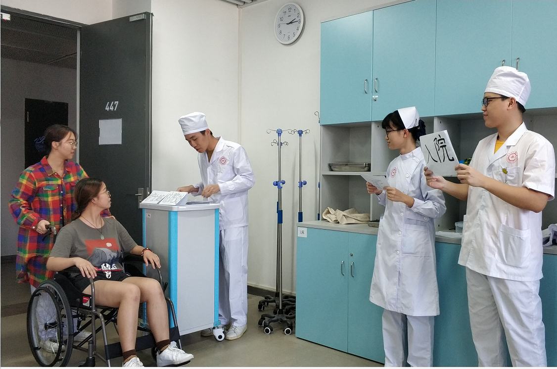 实验前,带教老师围绕本学期涉及的理论知识(如入院护理、饮食与营养、生命体征的评估与护理等)和操作技能(如生命体征的测量、给氧法、吸痰法和口腔护理等),以一例新收入院的“脑栓塞”患者为例,完成了情境案例的设计。收到案例后,同学们以小组为单位,对案例进行了分析和讨论,并结合查阅相关资料的结果,编写了情景剧本。为了更生动地模拟临床情景,部分小组甚至还准备了轮椅、饭盒、场景提示牌、自制的手腕带等道具。