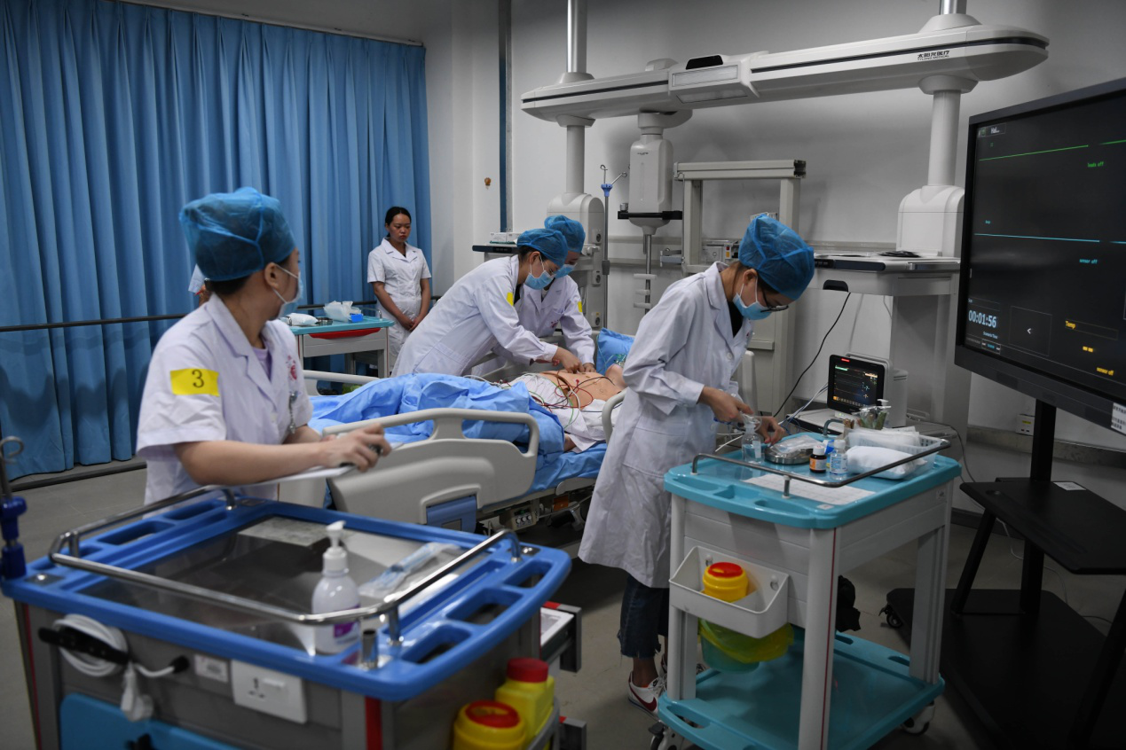 在ICU高级生命支持环节,逼真的抢救场面,情绪失控的家属的情景,给本环节比赛增添了几分紧张的氛围。各参赛选手分工明确、冷静应对、临危不乱实施抢救、遵医嘱用药,及时准确识别病情变化,及时给予安抚家属情绪,吸氧、心电监护、静脉输液、静脉注射、除颤及徒手心肺复苏,指导“患者”生命体征平稳,抢救成功。