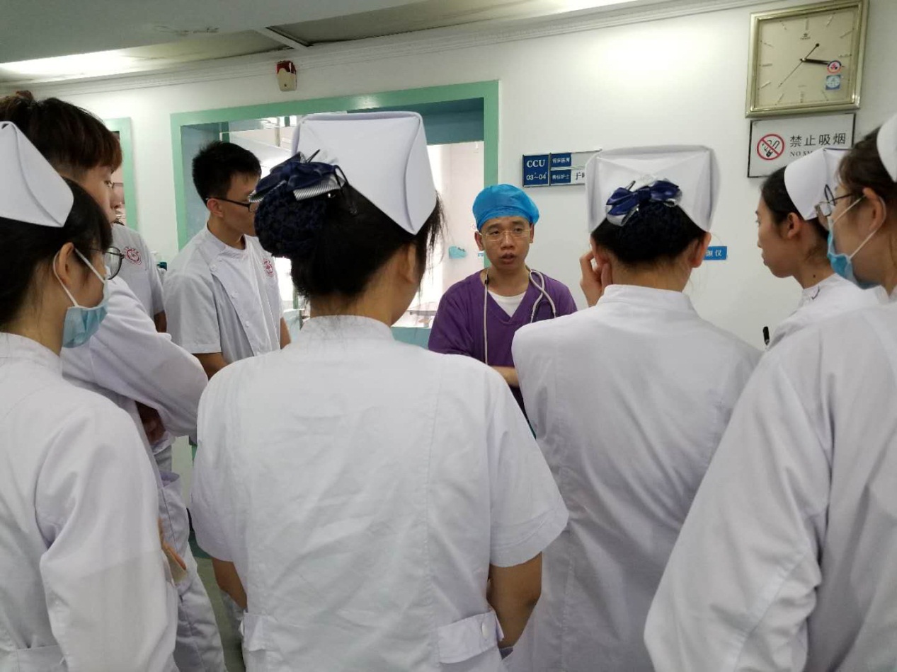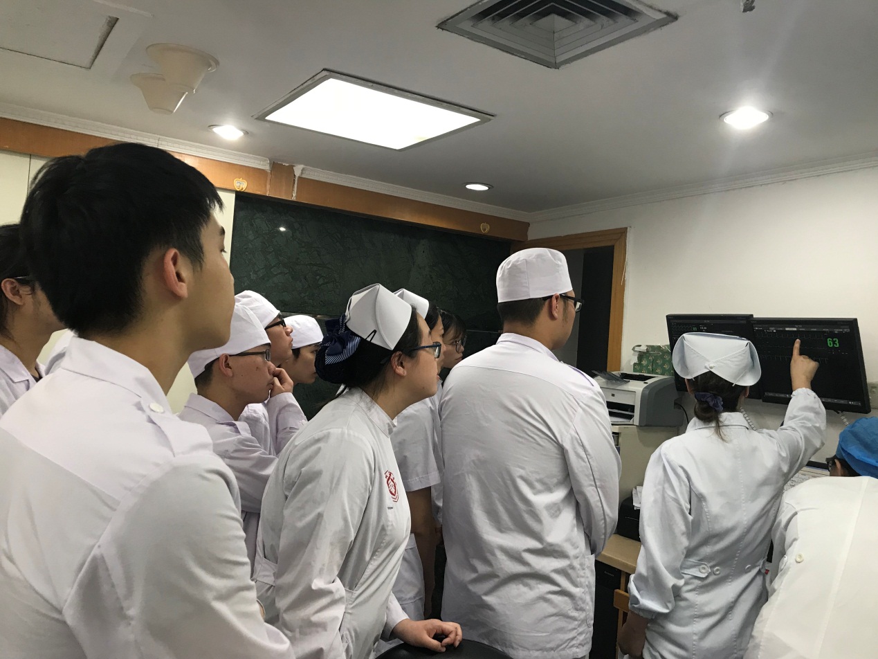 本次见习内容主要包括循环系统相关疾病介绍、患者护理评估、常见手术、常用药品及仪器介绍等。同学们在见习之前认真复习相关理论知识,在见习过程中对于有疑问的地方积极询问带教老师,相互探讨。同时,带教老师也会根据临床病例的具体情况对同学们进行提问,帮助同学们更好的理解和掌握相关知识。此外,三位老师还给同学们演示了常用仪器设备除颤仪的使用方法及注意事项,让同学们对除颤仪有了更加清晰直观的了解。
