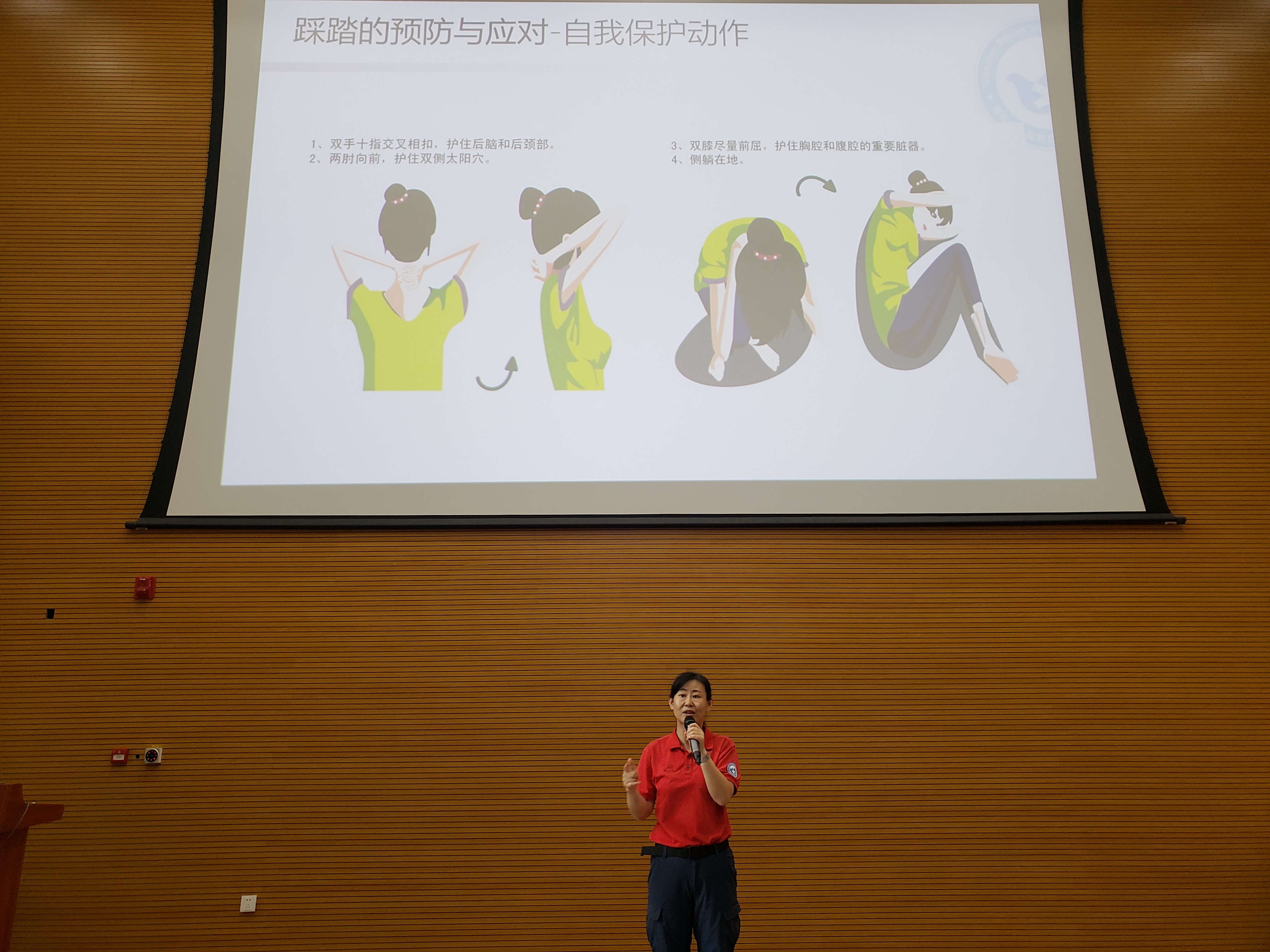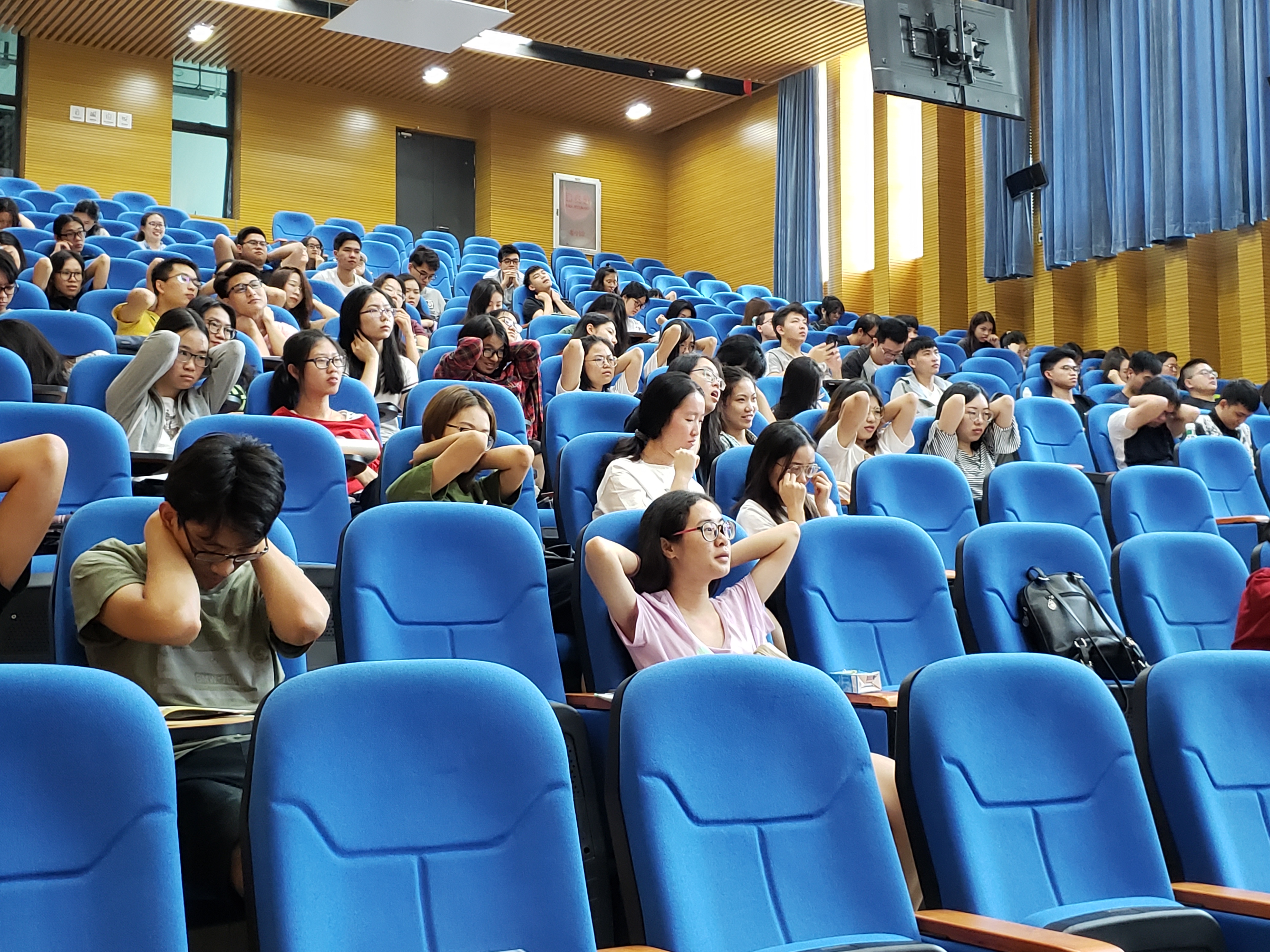 讲座共持续了三个小时,陈队长分别从备灾基础知识、踩踏的预防与应对、避险与逃生三个方面进行了详细的讲解,尤其在讲解踩踏的预防和应对中为同学们示范正确的自我保护动作,如“拳击手”、“双手抱头蜷缩”等。陈队长精彩的讲解以及自身丰富的防灾救援经历,激发了学生强烈的兴趣,现场气氛热烈。最后,讲座在同学和老师们的热烈掌声中圆满结束。