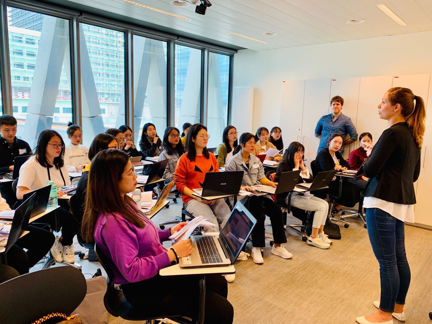 接下来的几天里,同学们开始了各课程的学习。在与当地学生一起参与的护理研究课堂中,Yannic Van Gils教授向同学们介绍了课程的框架,并对同学们进行了分组及各组研究方向的确定。在护理专业英语课堂中,Marilize教授表示,沟通是护理人员在临床工作中非常重要的一部分。在比利时这个多元文化及语言的国度中,医护人员间的专业性表达及与医患间的意思传达就显得尤为重要。她向同学们分析了在临床工作中医护人员及患者可能存在的沟通问题及会带来的后果。她让同学们玩了一个传话桶的游戏,在游戏的过程中,20位同学被分为两组,第一位同学作为医生,最后一名同学作为护士,由第一位同学往下传话到最后一位同学,过程中同学们或是受周围环境的影响,或是语言沟通的影响,到最后一位同学口中时,语句的意思完全变了样。这个游戏让同学们能更快理解实际工作中交流会出现的问题。生动有趣的课堂让同学们更加轻松的融入到课堂中。在中国,也有着不同文化程度、不同宗教信仰的人,同学们应借鉴在课堂所学,更好的利用到未来的临床工作中。