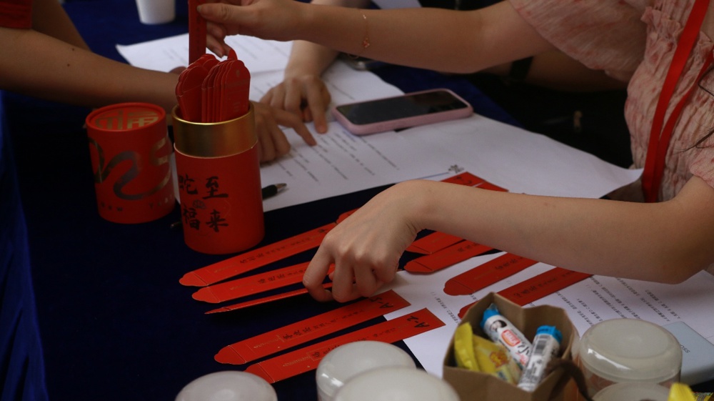 在养生问答摊位,同学们化身“养生探险家”,手执古朴竹签筒轻轻摇动,六支竹签跃然而出,开启了一场趣味盎然的知识探秘之旅。从“春夏养阳、秋冬养阴”的四季调养口诀,到八段锦柔中带刚的招式精髓;从太极拳行云流水的养生哲学,到桂圆、枸杞药食同源的智慧趣谈——千年养生智慧褪去厚重外衣,化作鲜活灵动的健康锦囊。竹签清脆的碰撞声与头脑风暴的答题声交织,传统养生文化以问答闯关的新颖形式焕发新生。在这里,养生不再是古籍中的晦涩词句,而是融入日常的轻盈实践,是年轻一代对生命之道的浪漫注解。