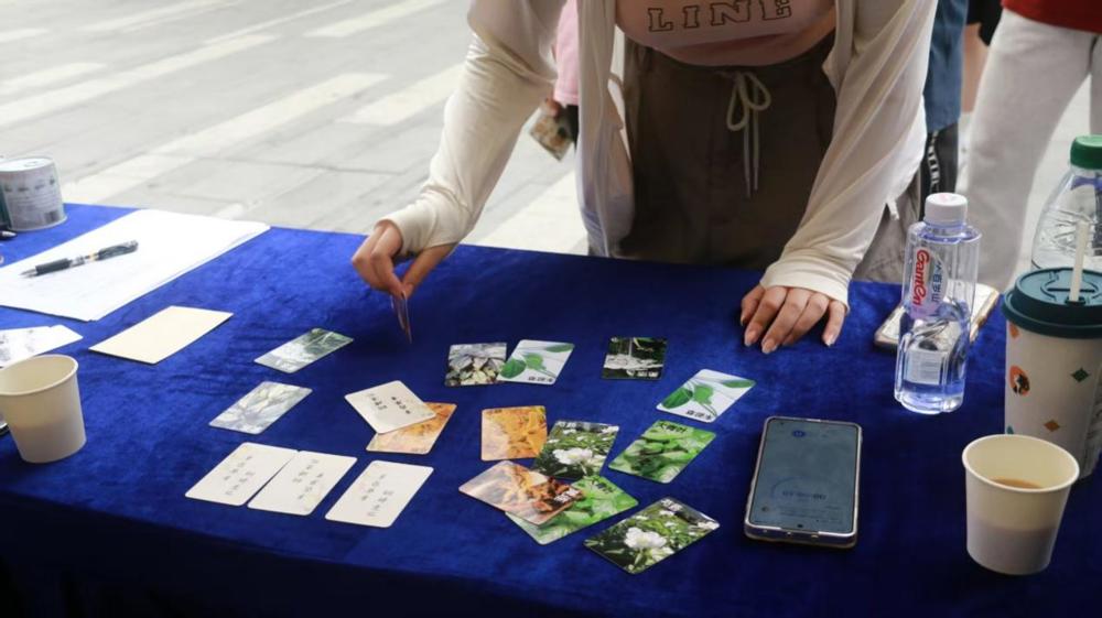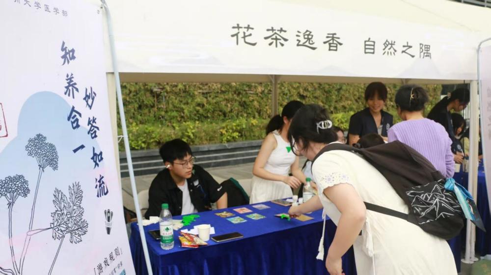在花茶摊位,同学们化身为“花茶寻香师”,手持小巴掌,轻轻一挥,便粘取到承载着花茶知识的卡片。每一次灵动的挥甩,都是一场探索花茶世界的奇妙旅程,从馥郁芬芳的各类花茶品种,到疏肝理气、美容养颜等神奇功效——古老的花茶智慧告别刻板印象,幻化成轻松有趣的互动体验。在这里,花茶不再是简单的饮品,而是连接自然与生活的诗意纽带,是同学们对传统韵味的清新追寻。
