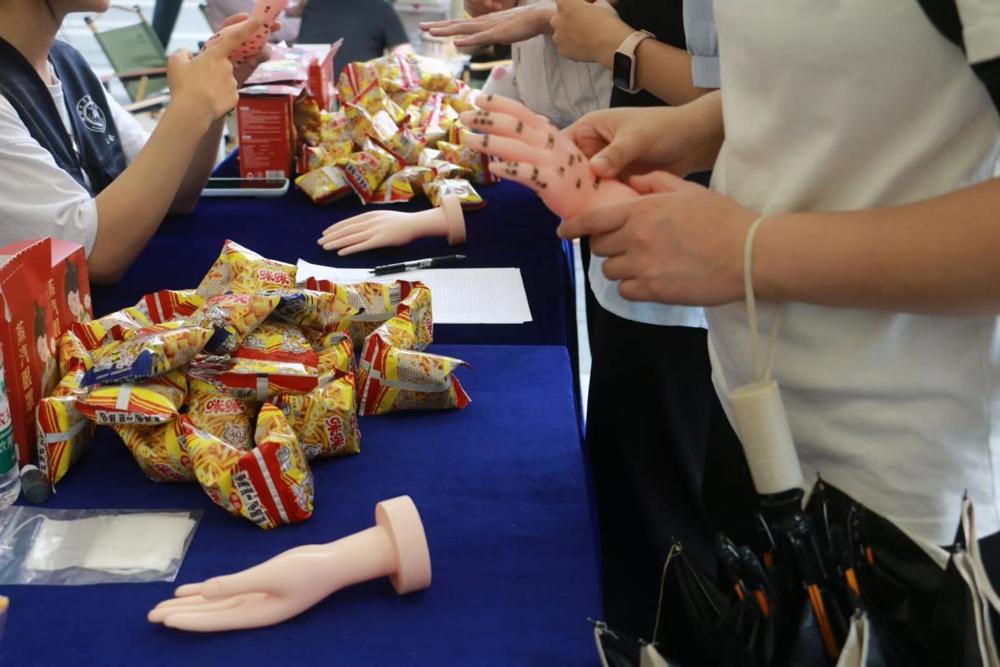 “穴位智探,手护先锋”摊位火热登场!趣味挑战点燃全场,同学们在1分钟指尖竞速中探寻经络奥秘。同学们在欢声笑语间精准定位穴位,触摸千年智慧。传统医学与青春活力激情碰撞,健康知识在掌心悄然传递,现场氛围热烈非凡!