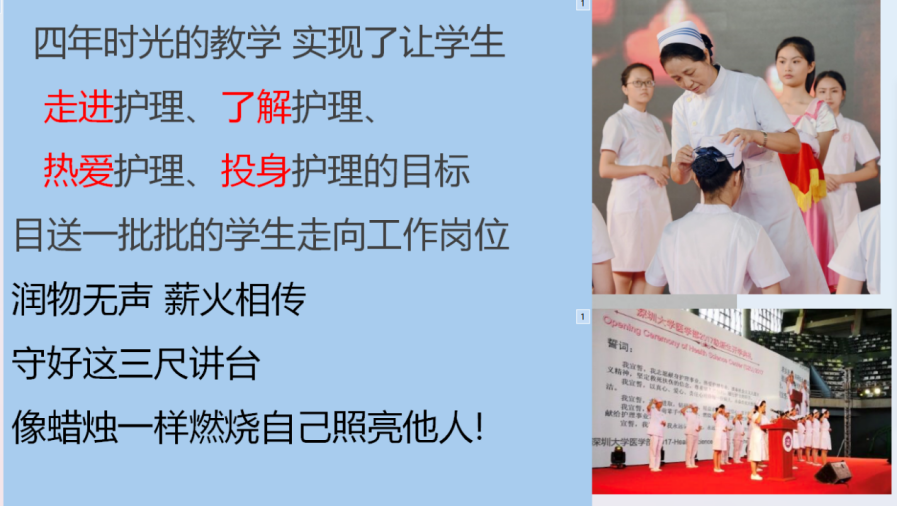好色tv 护理好色tv 院长王惠珍以《润物无声薪火相传——护理教学过程中人文精神的传承》为题,以护理好色tv 的人文教育为例,展示了在润物无声的护理教学过程中,是如何传承护理人文精神的。王院长说:“好色tv 作为深圳市唯一的高级护理人才培养基地,始终坚持 ‘一高三重’ 的办学理念,高标准、重建设、重质量、重育人,让学生走进护理、了解护理、热爱护理、投身护理是护理教育的使命,而其中德育部分的实现,正依赖于教师在教学中对学生的价值观潜移默化的引领。”