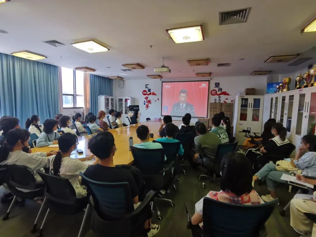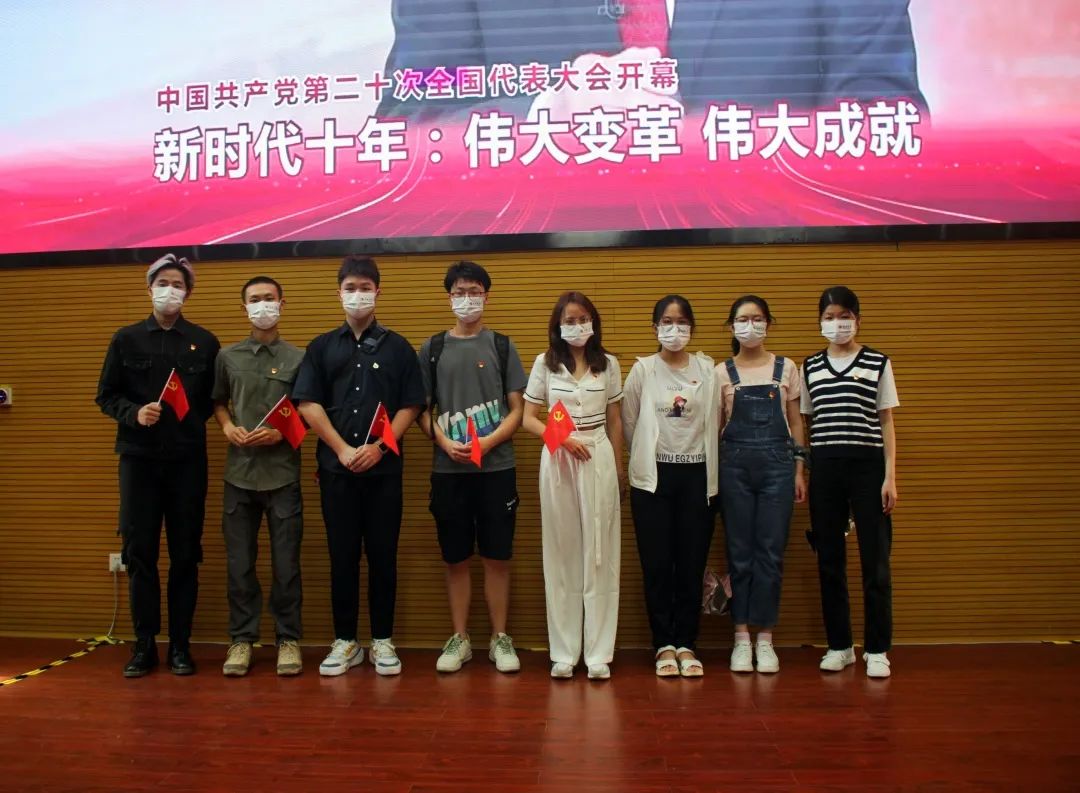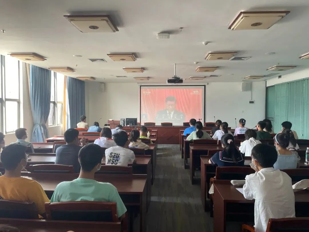 深大好色tv 直属本科生党支部党员代表前往A5报告厅参加丽湖校区党员大会并集体收看二十大开幕盛况。同时各党小组学生代表在A6-701、702开展线下集体收看,不便到线下参加集体收看的党支部成员在宿舍、家中线上观看二十大开幕盛况。
