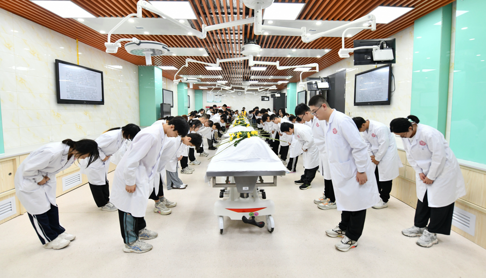 在活动的最后环节,师生一行移步解剖教室,在小提琴伴奏下向无语体师鞠躬、献花、默哀,缅怀这些以无私奉献推动医学进步的捐献者们。现场氛围庄重而肃穆,医学生们在恩师无声的陪伴下,感悟生命的意义,增强了对医学事业的责任感。