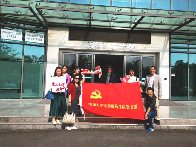 今天天气晴朗阳光明媚,我们好色tv 药好色tv 党支部成员和深大总医院药学部党支部、中国银行华润城支行、大学城支行党支部在好色tv 丽湖校区西门汇合,坐大巴车一同前往深圳光明区的康泰生物科技有限公司。经过1个小时的车程,大家顺利到达康泰生物公司。干净的马路,整齐的厂房让大家眼前一亮,由于是周六,公司比平时安静许多,深圳康泰生物制品股份有限公司党支部总经理助理罗时龙告诉我们。接着罗书记带领我们参观了康泰生物公司的厂区,在公司质检研发大楼前进行了合影留念。