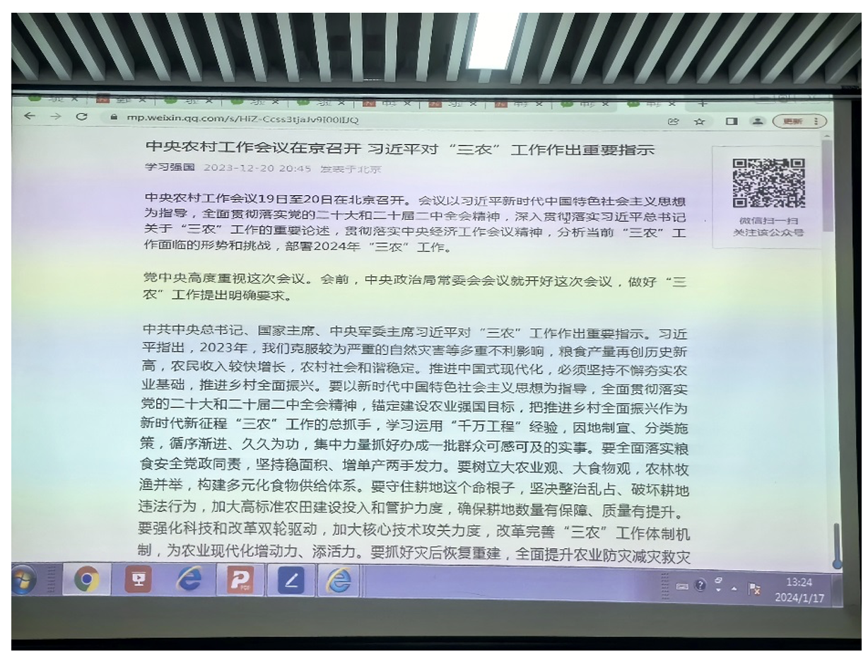 习近平总书记对“三农”工作作出重要指示,并指出2023年我们克服较为严重的自然灾害等多重不利影响,粮食产量再创历史新高,农民收入较快增长,农村社会和谐稳定。推进中国式现代化,必须坚持不懈夯实农业基础,推进乡村全面振兴。要以新时代中国特色社会主义思想为指导,全面贯彻落实党的二十大和二十届二中全会精神,锚定建设农业强国目标,把推进乡村全面振兴作为新时代新征程“三农”工作的总抓手,学习运用“千万工程”经验,因地制宜、分类施策,循序渐进、久久为功,集中力量抓好办成一批群众可感可及的实事。所有党员应深入学习领会习近平总书记对“三农”工作重要指示精神,应在落实乡村振兴战略、落实“百县千镇万村高质量发展工程”等工作中勇挑重担、争做先锋,切实把学习成效转化为工作实践。
