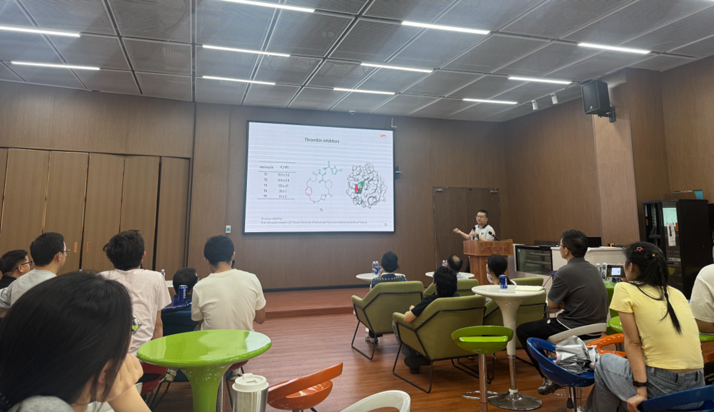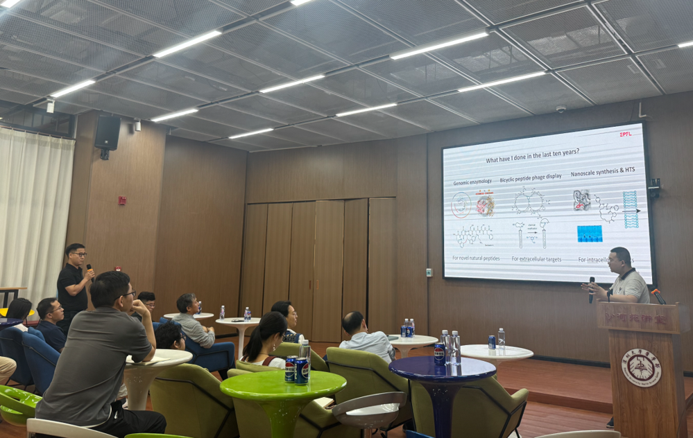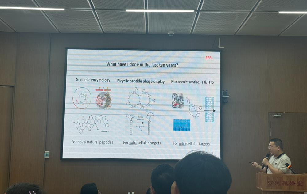由季鑫剑博士带来的关于“合成及筛选大规模环肽库以解决细胞内蛋白质-蛋白质相互作用”的专题报告,吸引了众多师生前来聆听。季鑫剑博士,作为多肽研究领域的先锋人物,专注于基于多肽的功能分子设计及其发现、超高通量纳摩尔合成与筛选平台开发以及天然产物(特别是活性多肽类天然产物)生物合成相关金属酶学等前沿领域。他致力于解决生物学和医学中的一些关键问题,尤其是在治疗性环肽的设计和开发方面取得了突破性的进展。