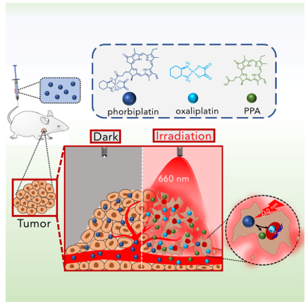 化疗依然是临床上治疗癌症的重要手段之一。大部分化疗药物由于缺少对肿瘤组织的选择性,杀死肿瘤细胞的同时也对正常组织产生毒副作用。因此,实现化疗药物在肿瘤组织中选择性激活从而降低化疗的毒副作用具有重要的临床价值。一种极具有潜力的解决化疗药物毒副作用的药物设计思路是制备光可控激活的前药。这类药物给药后在黑暗环境中稳定,毒性低;针对肿瘤位置进行光照时,肿瘤内的前药迅速活化成活性药,继而杀死肿瘤细胞。此研究中,将对红光响应的卟啉类氧化还原催化剂脱镁叶绿素(pyropheophorbide-a, PPA)引入到惰性的基于奥沙利铂的四价铂前药中得到了首例高效红光可控激活小分子四价铂前药(phorbiplatin)。该前药在生理条件下稳定,化学惰性高,毒性极低。在低强度的红光(650 nm, 7 mW/cm2)照射下,前药迅速还原成活性药奥沙利铂并释放PPA,发挥抗肿瘤活性。进一步对前药的光活化机理进行了深入的研究表明,激发态的PPA从还原剂中得到电子生成还原态的PPA,继而将电子传递给四价铂中心,启动前药的还原过程,这揭示了其独特的光活化机制。最后,团队人员将前药注射到小鼠肿瘤模型中,给药后对小鼠肿瘤进行红光照射。结果表明,与奥沙利铂及奥沙利铂与PPA的混合物相比,该前药具有更强的体内抗肿瘤活性,并且比奥沙利铂和PPA的混合物具有更低的毒性。这项研究首次报道了可以运用到活体内的红光可控激活的铂类前药,为设计光可控激活的四价铂前药提供了一种新的策略,对开发新型可控低毒性的化疗药物具有重要意义。