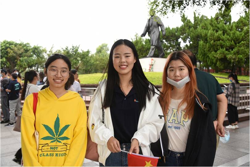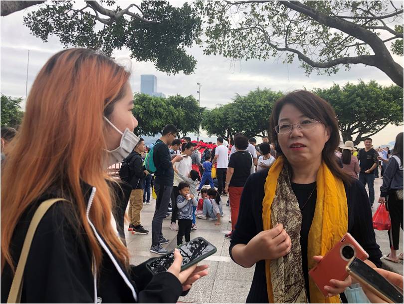 同学们趁此机会,迎上前去,友好、礼貌地向游客招呼,提出此前准备好的四个重要问题——您的青春关键词是什么?您青春与祖国的联系是什么?您对深圳的印象是什么?在这次随机即采访中,受访者的年龄、性别、生活情况都大不相同,但当被问及上述问题时,无一例外地露出了微笑:小朋友们天真灿烂地笑着,向采访的大哥哥大姐姐们细数着他们在深圳的快乐回忆;年轻人腼腆地笑着,不好意思地讲述着自己在深的工作计划,言行举止间满怀着对深圳的好奇和对未来的憧憬;老年人对镜头咧开嘴露出牙齿,谈及过去的苦涩和现在的幸福,乐得眯起双眼。看着受访者们用不同的神态表达着自己对青春、对深圳、对祖国的各种看法,同学们往往忍俊不禁,和受访者们交谈甚欢,采访完后还意犹未尽地请求和采访者共同合影,借此机会在这特殊的日子里,和有缘相逢的同胞一起在深圳留下青春的美好回忆。