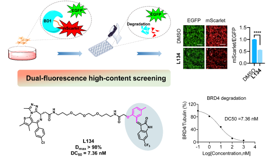 该研究团队在先前研究的基础上(PLOS Biol. 2024, 22, e3002550),新设计合成了一系列基于烯基氧化吲哚结构的BRD4-PROTAC先导化合物。采用mScarlet/ EGFP 的双荧光报告细胞系,结合细胞高内涵成像技术,实现了细胞中靶蛋白降解效率的高通量高效率评估。通过这种高通量筛选策略,该团队筛选获得了一种强效的BRD4-PROTAC先导化合物L134(Dmax > 98%, DC50 = 7.36 nM)。L134不仅能显著抑制多种乳腺癌细胞的增殖,还可抑制乳腺癌细胞迁移并诱导细胞凋亡,表明了L134的抗乳腺癌潜力。